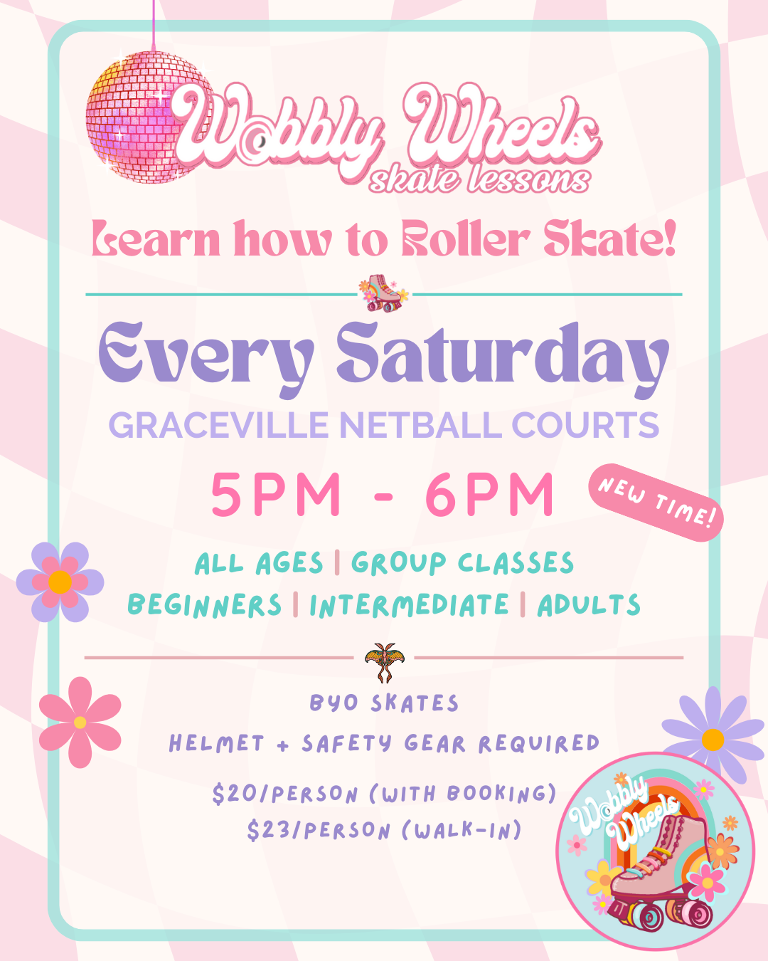 Our classes are hosted at the freshly paved Graceville Netball Courts where you enjoy a one hour class that combines a variety of skate drills, skill progressions, fun games and music. If our class times don’t fit into your schedule or you don’t like being in a group class, we may be able to provide private one-on-one classes and travel to a location convenient for you.