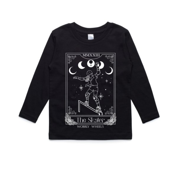 Stay warm while you skate with our Gildan Long Sleeve Shirt in black! 🖤 Hand-drawn by Coach Layla, featuring a mystical tarot design with Coach Paige at our favorite local skatepark. Available in sizes Kids 8 to Adult 3XL. 🌟 Pick up directly from our classes at Graceville or Ipswich, or have it shipped to your doorstep! 🚚